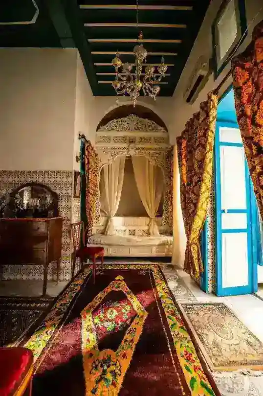 Dar Hassine Allani n’est pas seulement un lieu d’hébergement : c’est aussi un véritable musée vivant. La maison est un exemple remarquable de l’architecture arabo-musulmane, soigneusement préservée pour mettre en valeur :